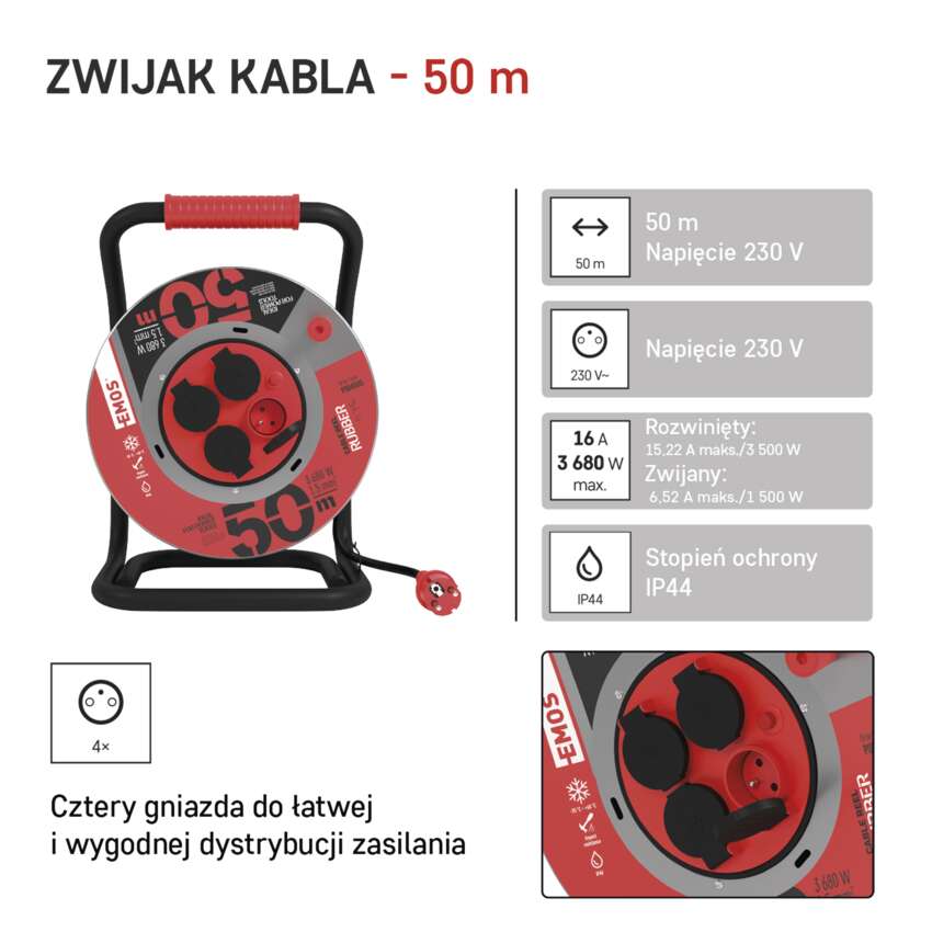 Przedłużacz w domach, warsztatach, lekkich pracach umożliwia podłączenie czterech urządzeń elektrycznych jednocześnie. Łatwe nawijanie kabla zapewnia ucho prowadzące i solidny metalowy korpus. Przewody gumowe H05RR-F przeznaczone są do średnich obciążeń mechanicznych w środowisku zwykłym, zimnym i gorącym, wilgotnym i mokrym. Kabel o przekroju żyły 1,5 mm2 wytrzymuje wodę, wilgoć, niskie i wysokie temperatury od -25 °C do +60 °C, oferując wszechstronne zastosowania. Jeśli szukasz niezawodnego partnera, który posłuży Ci przez wiele lat, postaw na wysokiej jakości bęben EMOS oferowany z przedłużoną trzyletnią gwarancją.