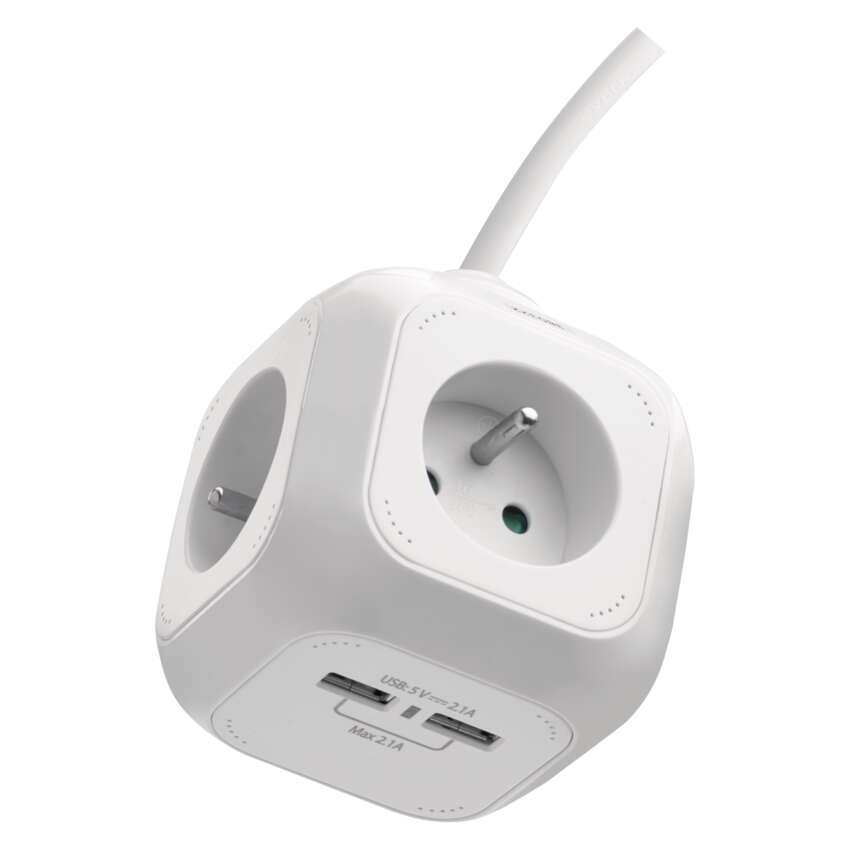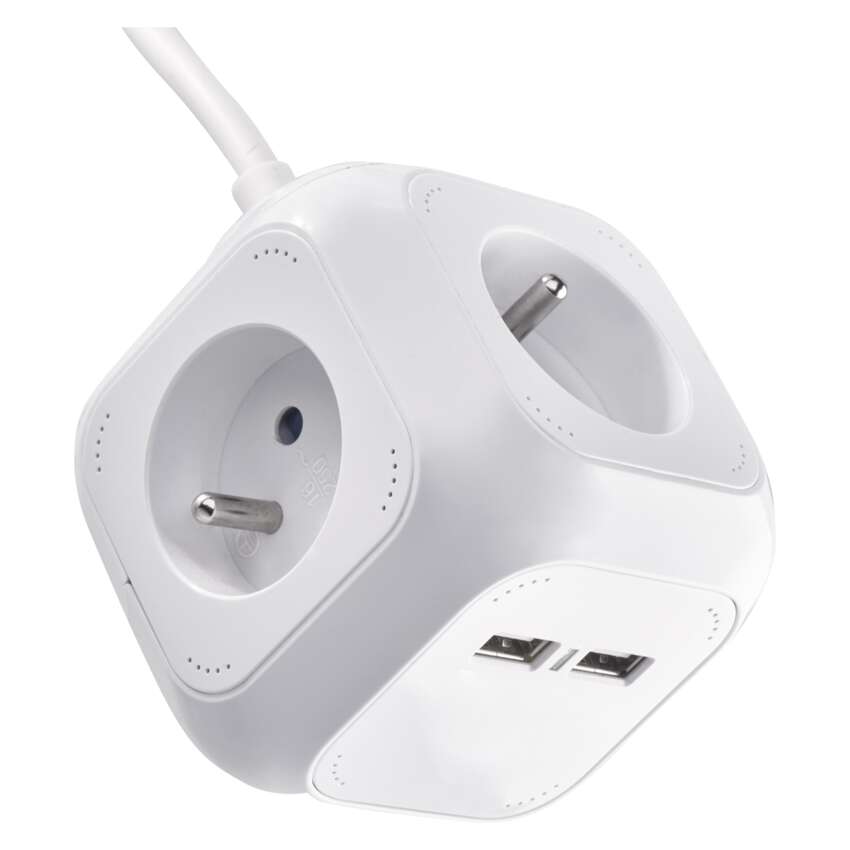 Przedłużacz - kostka 1,9 m / 4 gniazda / biały / PVC / z USB portem / 1 mm2