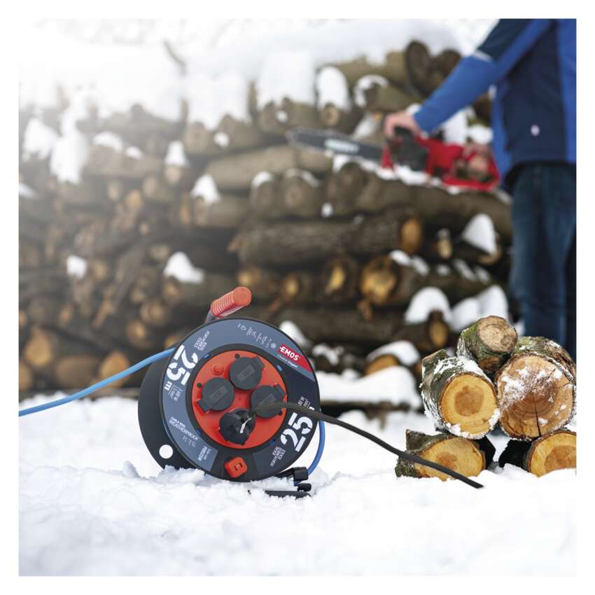 Niezależnie od tego, czy pracujesz w upalny letni dzień, czy w ujemnych temperaturach znacznie poniżej zera, przedłuzacz zwijany Weatherproof zapewnia łatwy dostęp do energii elektrycznej. Może pełnić swoją funkcję w szerokim zakresie temperatur roboczych od -35°C do +60°C. Ponadto niebieski przewód ma zwiększoną odporność na promieniowanie UV i jest bezwonny w porównaniu do przewodu gumowego.