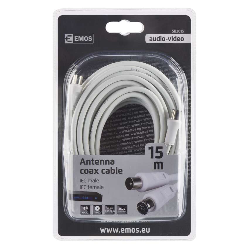 Koncentryczny przewód antenowy z wtyczką i gniazdkiem IEC. Przewód jest podwójnie ekranowany w celu redukcji zakłóceń elektromagnetycznych. Długość przewodu wynosi 15 m.Przewód koncentryczny jest przeznaczony do SAT, DVB-T, ANT, DECODER, FLAT TV i TV.