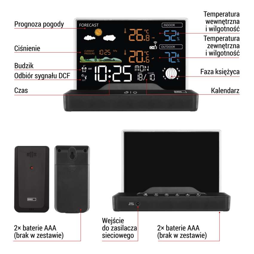 Stale podświetlany wyświetlacz LED VA oferuje lepszy kontrast i najciemniejszy odcień czerni. Wyświetlacz jest pięknie czytelny w każdych warunkach oświetleniowych. Stylowy i nowoczesny design stacji pogodowej sprawi, że stanie się ona ozdobą wnętrza każdego domu. Stacja pogodowa zasilana jest stale za pomocą zasialcza lub 2× baterii AAA, które nie są dołączone do zestawu.