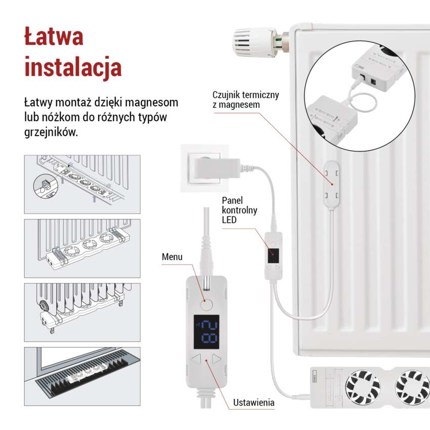 - Łatwa instalacja i elastyczne rozmieszczenie - może być łatwo i szybko zainstalowany na większości elementów grzejnych bez potrzeby stosowania skomplikowanych narzędzi lub profesjonalnej pomocy