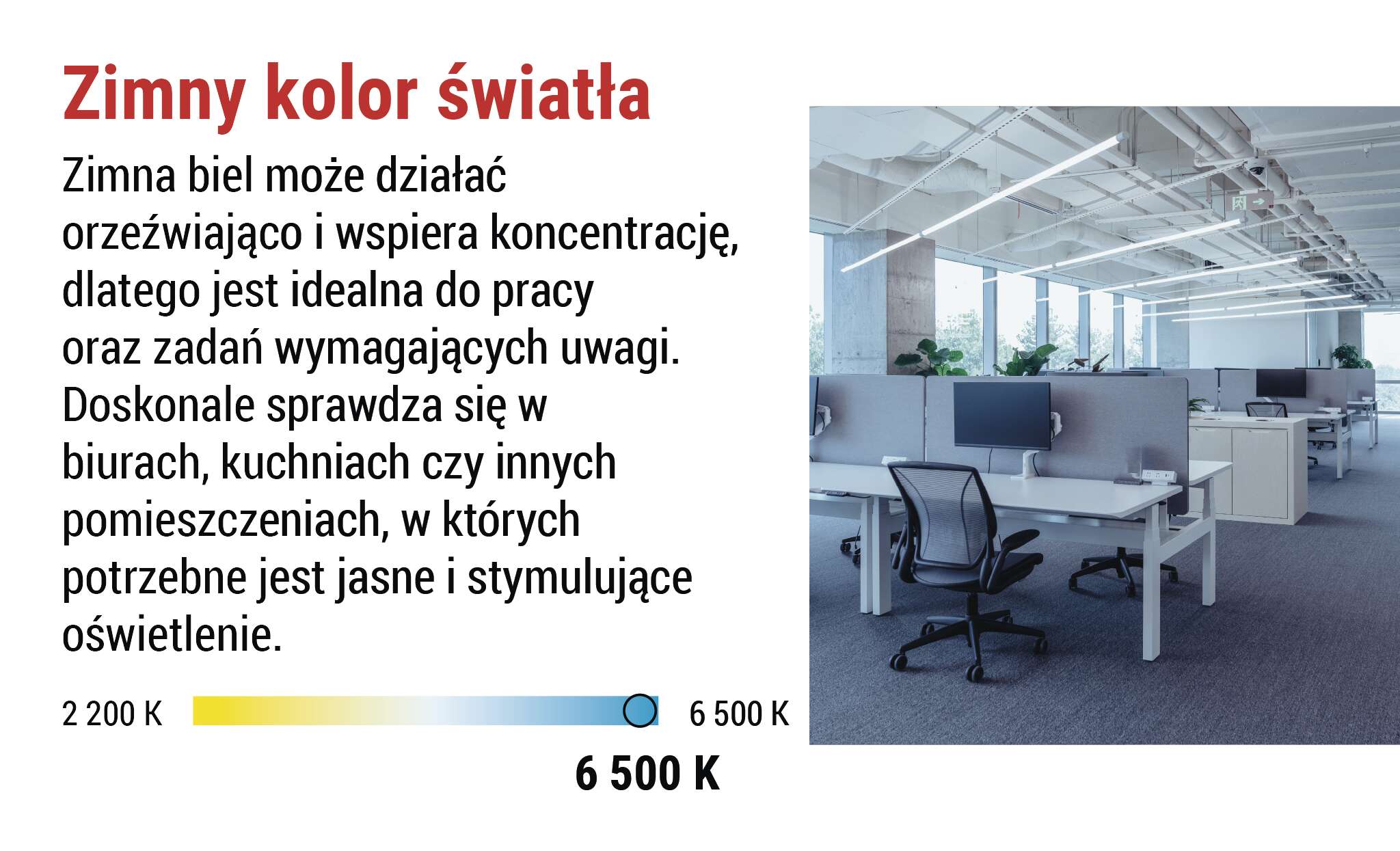 Chłodne białe światło sprawia, że szczegóły są wyraźnie widoczne, a kontrasty bardziej wyraziste, co sprzyja skupieniu i precyzyjnej orientacji. Ułatwia to pracę i zmniejsza zmęczenie oczu podczas długotrwałego użytkowania w obszarach wymagających precyzyjnego widzenia. Technologia LED zapewnia również równomierny rozkład światła, bez migotania i niepożądanych cieni, dzięki czemu uzyskany efekt jest wygodny i niezawodny dla każdego użytkownika.